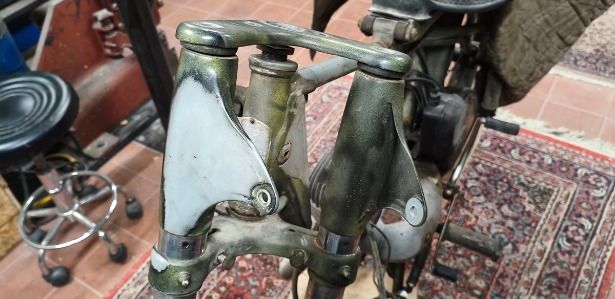 Der Lack ist offensichtlich verhunzt. Mit Verdünner bekommt man die “Tarnfarbe” zwar stellenweise ganz gut ab und kann die graue Originallackierung freilegen. Aber nicht überall. Vor allem der Tank wurde vorher angeschliffen. Deshalb muss leider alles neu lackiert bzw. gepulvert werden. Ein Jammer. 🙁