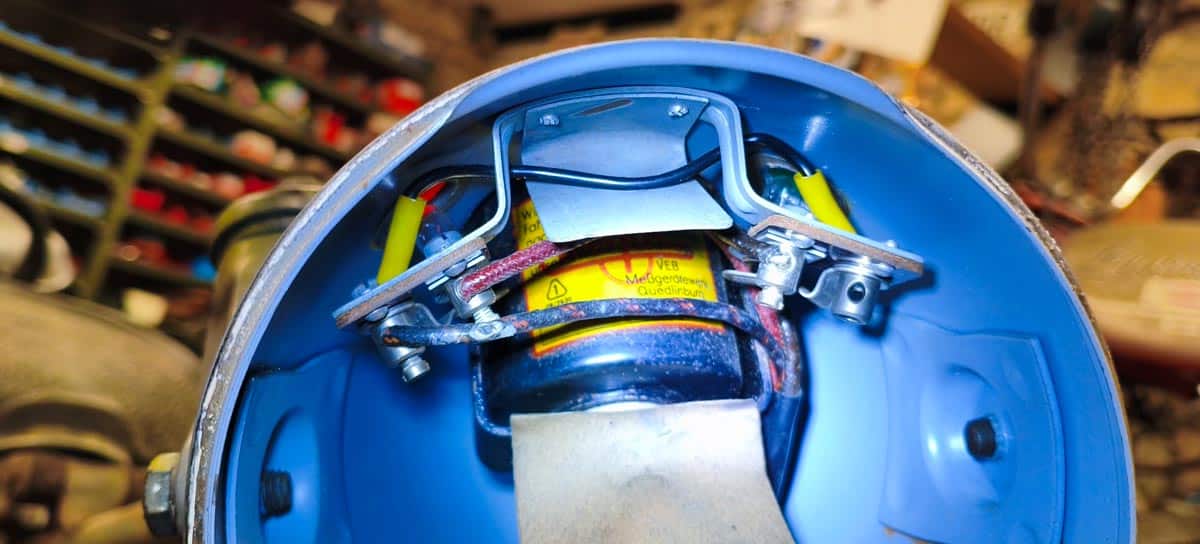 Der Blick in den Lampentopf offenbart unberührt und kaum gealterte Technik. Nur das Kabel oben sieht nicht original aus.