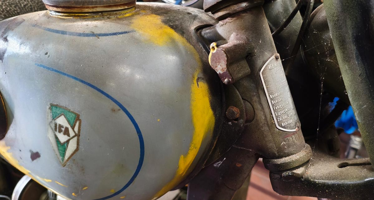 Es handelt sich um eine IFA RT 125/1 von 1955. Das letzte Modell, das noch offiziell das “RT” im Namen trug. Die /1 erschien 1954 und war deutlich weiterentwickelt: Neuer Vergaser, neuer Zylinder, Leistungssteigerung auf 5,5 PS, Kettenschläuche und Kettenkasten, etc. Insgesamt wurden sehr viele Mängel der Nullversion behoben.