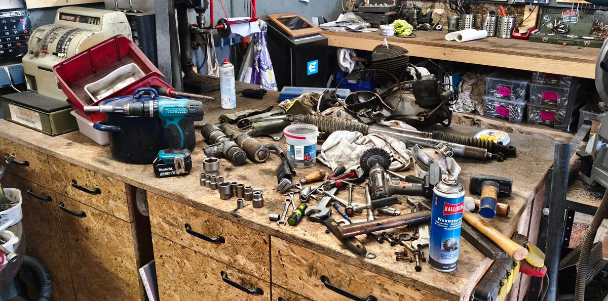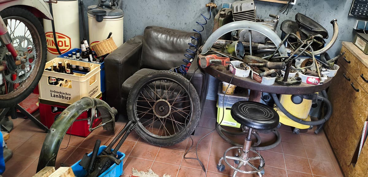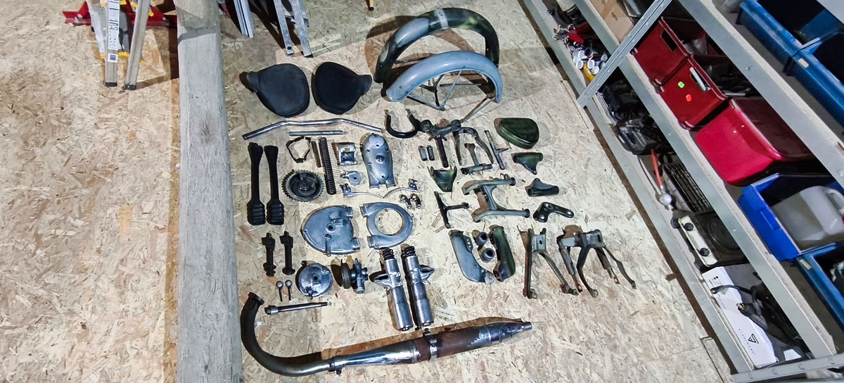 Die links sind schon aufbereitet. Die rechts werden pulverbeschichtet. Viel fehlt auf dem Foto gar nicht. Eigentlich nur Rahmen, Räder, Tank und Motor. Erstaunlich, wie wenig eigentlich an dem Moped dran ist.
