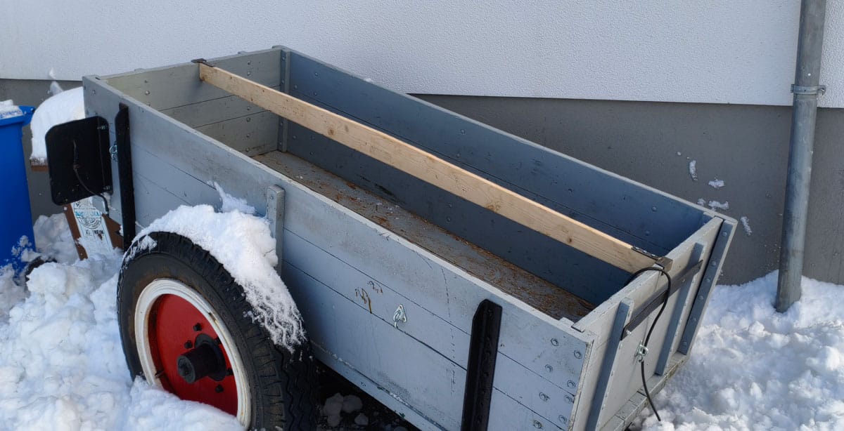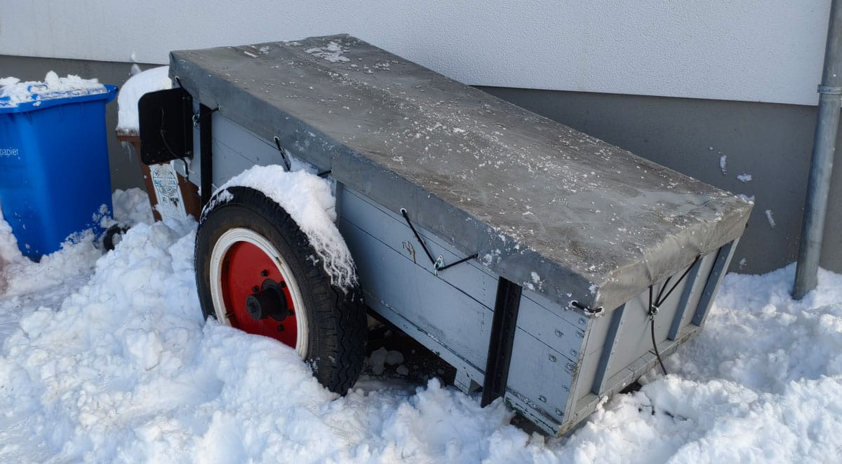 Was dagegen wunderbar funktioniert hat, ist meine selbstgebaute Planenstütze. Beim letzten Schneefall vor ein paar Wochen hatte ich nämlich das Problem, dass der Schnee die Plane tief in den Hänger gedrückt hatte und sich dann sehr viel Wasser in der Kuhle sammeln konnte.