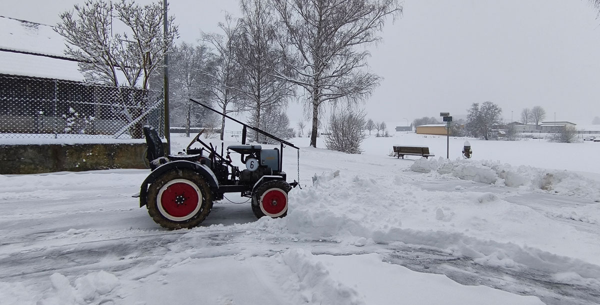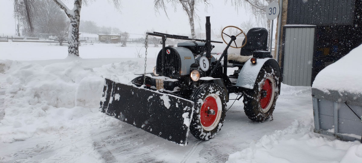 In den letzten Tagen gab es einen Wintereinbruch, wie er hier im “mediterranen” Mainfranken eher selten vorkommt: Gute 25 cm Neuschnee innerhalb eines Tages! Die perfekte Gelegenheit also, um Traktor und MZ-Gespann an ihre Grenzen zu bringen.