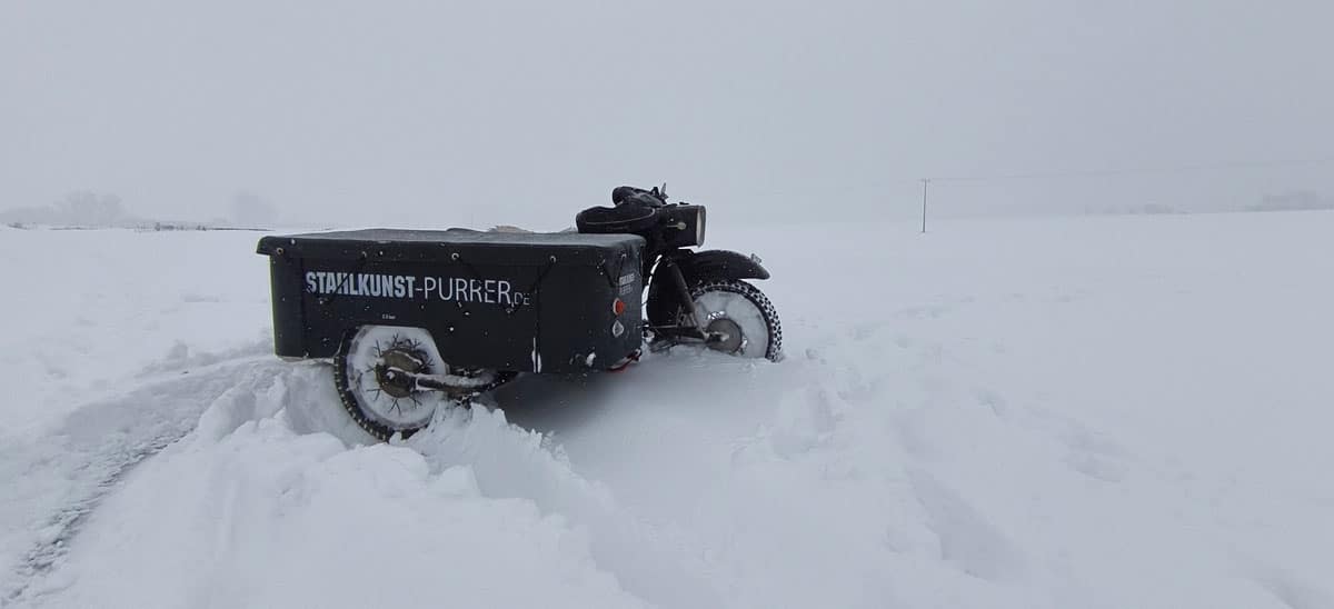 Nachdem ich den Traktor an seine Grenzen gebracht hatte, wollte ich die Winterlandschaft auch noch mit dem Gespann erkunden. Nächste Woche steht nämlich wieder das Puristentreffen auf der Schwäbischen Alb an. Da kann es nicht schaden, das Moped vorher auf Herz und Nieren und Wintertauglichkeit zu testen.