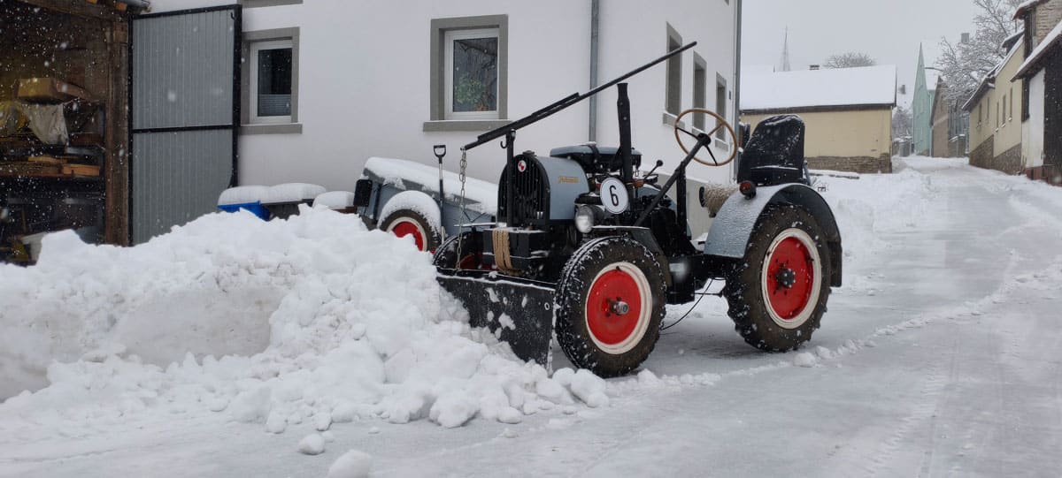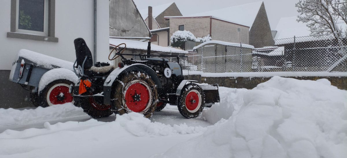 In den letzten Tagen gab es einen Wintereinbruch, wie er hier im “mediterranen” Mainfranken eher selten vorkommt: Gute 25 cm Neuschnee innerhalb eines Tages! Die perfekte Gelegenheit also, um Traktor und MZ-Gespann an ihre Grenzen zu bringen.