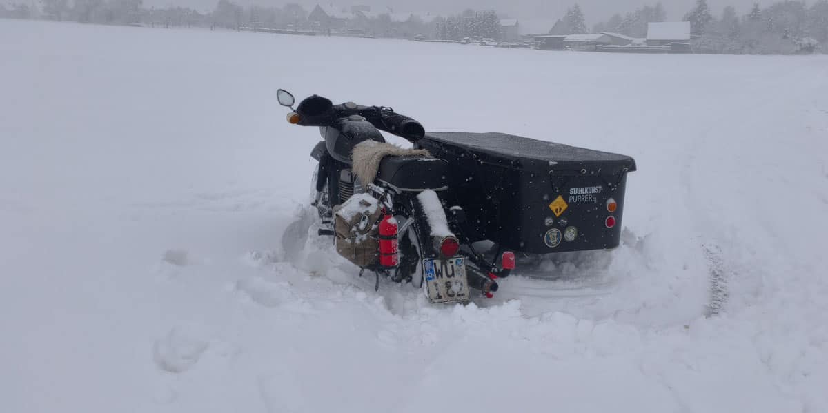 Nachdem ich den Traktor an seine Grenzen gebracht hatte, wollte ich die Winterlandschaft auch noch mit dem Gespann erkunden. Nächste Woche steht nämlich wieder das Puristentreffen auf der Schwäbischen Alb an. Da kann es nicht schaden, das Moped vorher auf Herz und Nieren und Wintertauglichkeit zu testen.