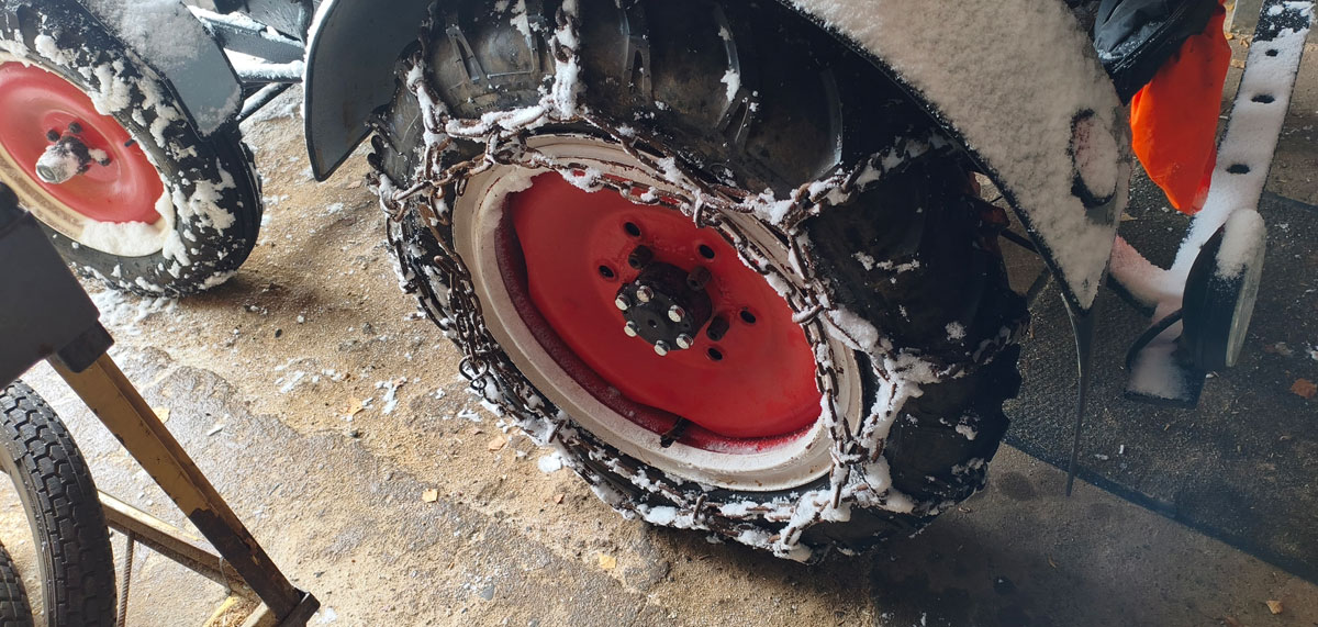 Ich habe den Luftdruck ganz leicht reduziert, damit die Reifen mehr Aufstandsfläche haben. Allerdings sind die Reifen ohnehin sehr schmal und für den kleinen Traktor ziemlich dickwandig. Sie verformen sich also kaum, auch wenn ich Luft ablasse. Da müsste ich schon sehr viel ablassen, und dann hätte ich Angst, dass die Reifen auf der Felge durchdrehen und mir die Ventile aus den Schläuchen reißen. Deshalb habe ich die Schneeketten rausgekramt, die ich zum Traktor dazubekommen hatte. Sie waren schnell montiert und ich konnte mich wieder ins Schneetreiben stürzen.