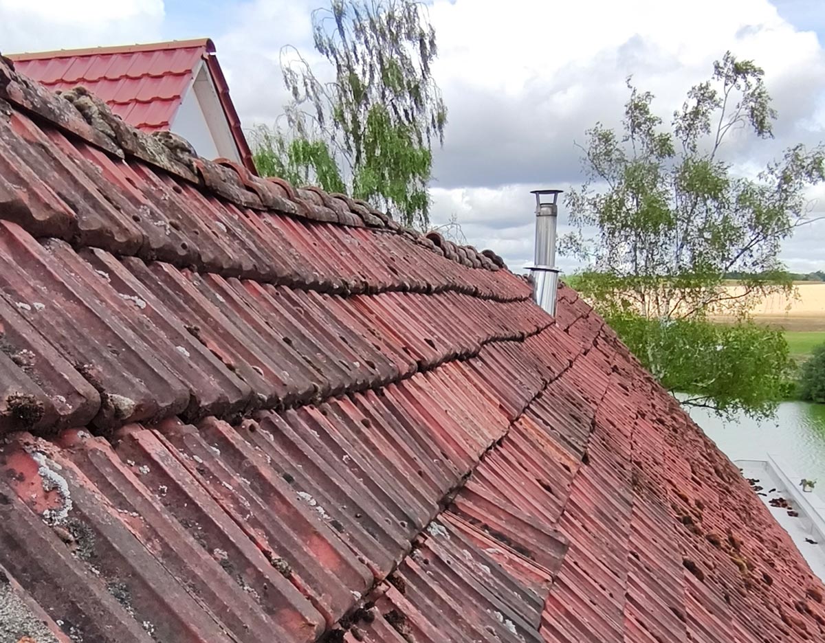 Dem Scheunendach sah man schon von außen an, dass es seine besten Zeiten hinter sich hatte: Es hing stark durch, Giebel und Sparren bildeten eine deutliche Wellenlinie und an verschiedenen Stellen hingen Ziegel schief oder fehlten ganz. Dementsprechend regnete es auch an vielen Stellen rein.
