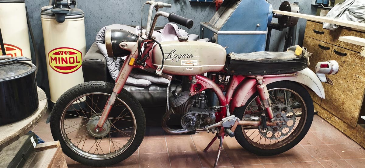 Die Italo-Harley habe ich in den letzten Monaten nur von einer Ecke der Werkstatt in die andere geschoben. Ich habe aber alle Teile da, um den Motor zusammenzusetzen und einen Testlauf zu starten. Dann weiß ich immerhin, ob es sich lohnt, weitere Arbeit in den kleinen Zweitakter zu investieren.