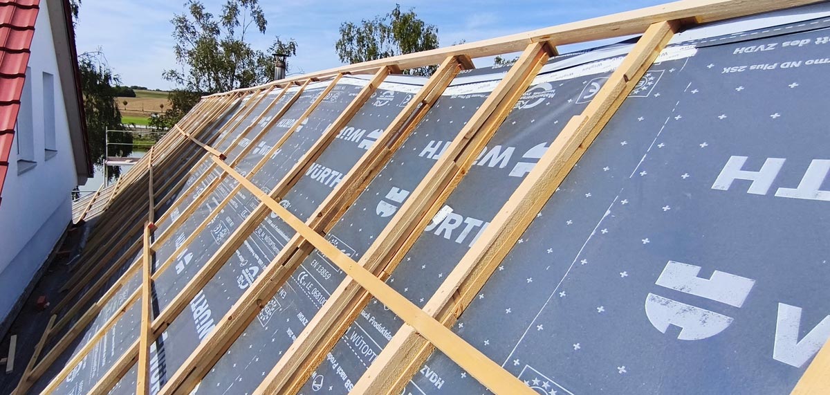 Dann haben wir ca. 10 Sparren komplett ausgetauscht, weil sie weggefault oder viel zu krumm waren. Danach Unterspannbahn drauf, um das Dach schnell wieder dicht zu bekommen. Jetzt wurde es richtig kniffelig: Um die Wellen rauszubekommen, musste ich stellenweise bis zu 4 Konterlatten auf die Sparren nageln (4x3cm = 12 cm!). Eine langwierige und auch anstrengende Arbeit, komplett alleine in luftiger Höhe unter brennender Sonne. Hat aber Spaß gemacht und sich gelohnt.